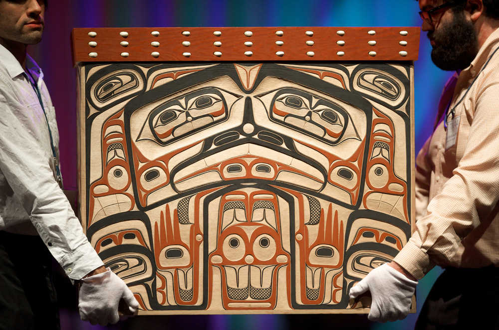 The artists included David Boxley, a Tsimshian carver whose bentwood chest was among the largest items in the live auction. Also in attendance was Haida artist Robert Davidson, who donated a black-and-red painting called “Greatest Echo.”