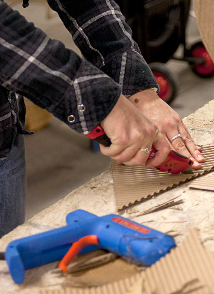 Photo by Rashah McChesney/Peninsula Clarion Chelsea Springer, freshman, cuts a piece of cardboard to add to a piece needed for her sculpture class Wednesday Feb. 26, 2014 at Kenai Peninsula College Kenai River Campus in Soldotna, Alaska. The assignment began with students building a smaller form and transforming it into a larger piece. "It's pretty abstract, but I think it kind of looks like a reclining person. Or an octopus. It's open to interpretation," she said.
