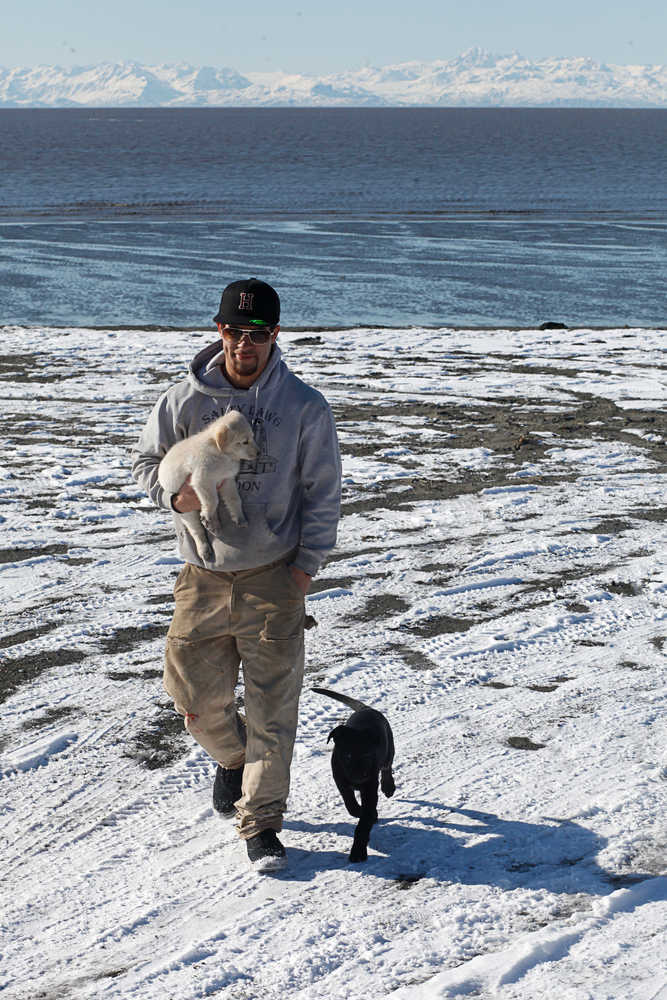 Photo by Rashah McChesney/Peninsula Clarion Julien Harris, of Soldotna, carries his puppy Jazzy while his other puppy, Roscoe, runs alongside near the Old Cannery Road entrance to the beach just south of the mouth of the Kenai River Thursday March 20, 2014 in Kenai, Alaska. Thursday's vernal equinox - the first day of spring in the Northern hemisphere - was marked by sunny weather and a 32 degree high temperature in Kenai.