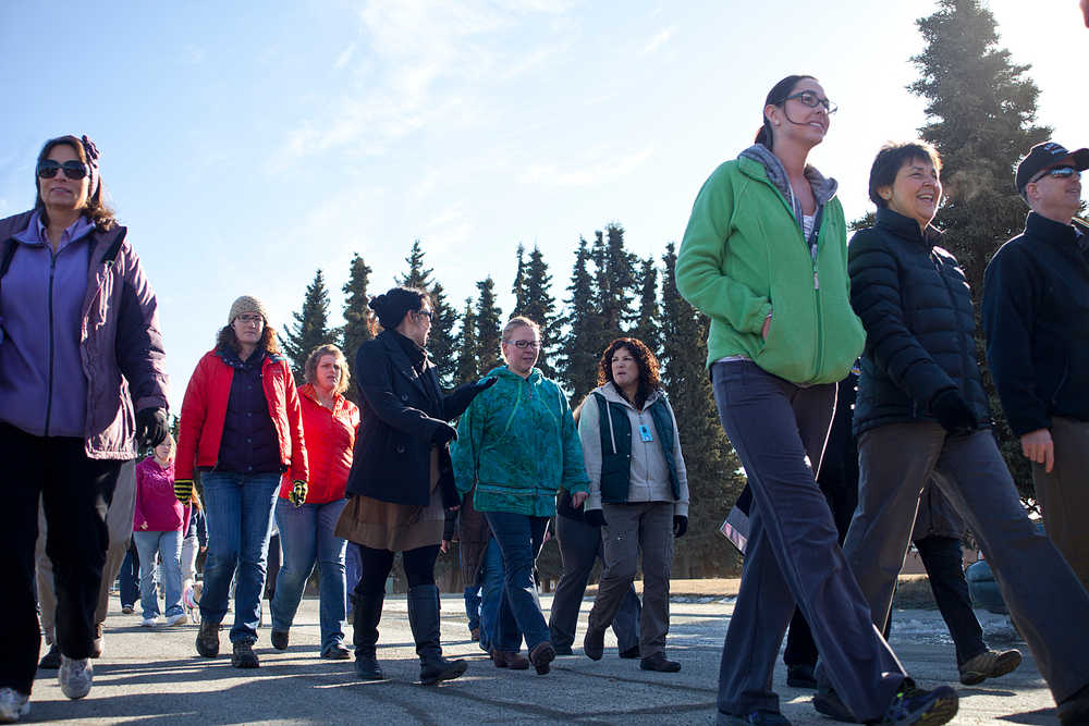 The crowd was the largest to participate in the Kenai event, as numbers seems to grow each year, said Cheri Smith, executive director of the LeeShore Center. Last year, 75 people took part in the walk, despite freezing temperatures. Smith said the growing numbers are an encouraging because it takes a social movement to change violence against women.
