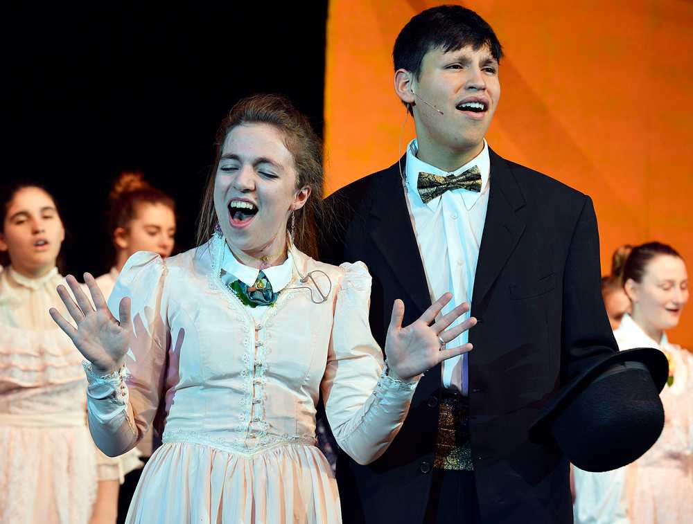 Photo by Dan Balmer/Peninsula Clarion Nikiski seniors Hannah Tauriainen and Richard Vollertsten sing the finale of "Hello Dolly" during a dress rehearsal Tuesday. Vollertsten plays Horace Vandergelder, a rich, gruff widower looking for a wife. Tauriainen plays Dolly Levi, a widow and a matchmaker.