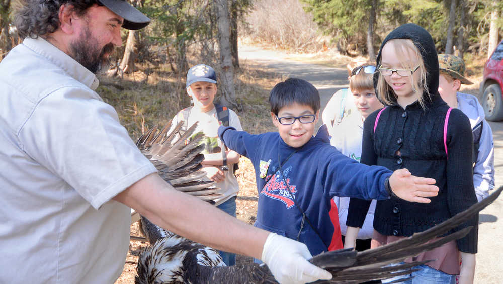 Photo by Rashah McChesney/Peninsula Clarion  Todd Eskelin, wildlife biologist, holds an eagle's wings open for Felix Lybarger compares himself to its wingspan and Jessica Croom looks on Saturday May 3, 2014 during a Youth Game Warden camp at the Kenai National Wildlife Refuge headwarters in Soldotna, Alaska.
