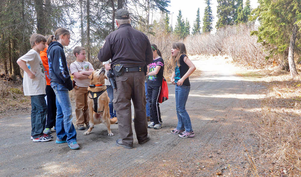 Photo by Rashah McChesney/Peninsula Clarion  United States Fish and Wildlife Service's Rob Barto tells a group of students at a Youth Game Warden camp about his yellow lab Rex and how Rex is used to find evidence of paching and illegal trafficking of wildlife Saturday May 3, 2014 at the Kenai National Wildlife Refuge headquarters in Soldotna, Alaska.