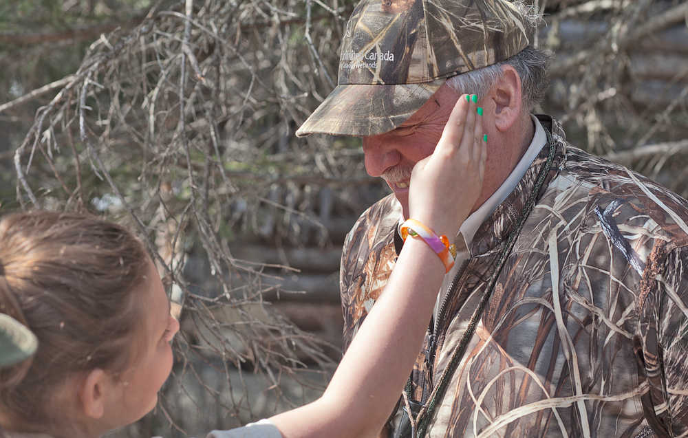 Photo by Rashah McChesney/Peninsula Clarion Dana Gibson brushes a mosquito off of Andy Loranger, Refuge Manager at the Kenai Wildlife Refuge, Saturday May 3, 2014 during a Youth Game Warden Camp at the refuge headquarters in Soldotna, Alaska.