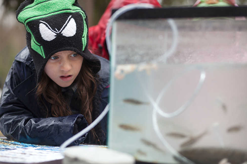 Photo by Rashah McChesney/Peninsula Clarion Malaina Maal, 8, a third-grade student from Soldotna Montessori, tries to identify several species of fish inside of an aquarium set up at the Alaska Department of Fish and Game's annual Salmon Celebration Tuesday May 6, 2014 at the Johnson Lake Campground in Kasilof, Alaska.