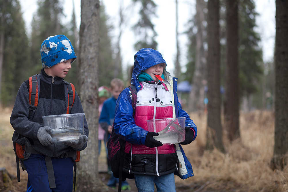 Photo by Rashah McChesney/Peninsula Clarion Jakob Murphy looks into Cadence Campbell's bucket as the two McNeil Canyon Elementary School third-graders carry rainbow trout down to Johnson Lake for release Tuesday May 6, 2014 in Kasilof, Alaska. The release was part of the Alaska Department of Fish and Game's annual Salmon Celebration.