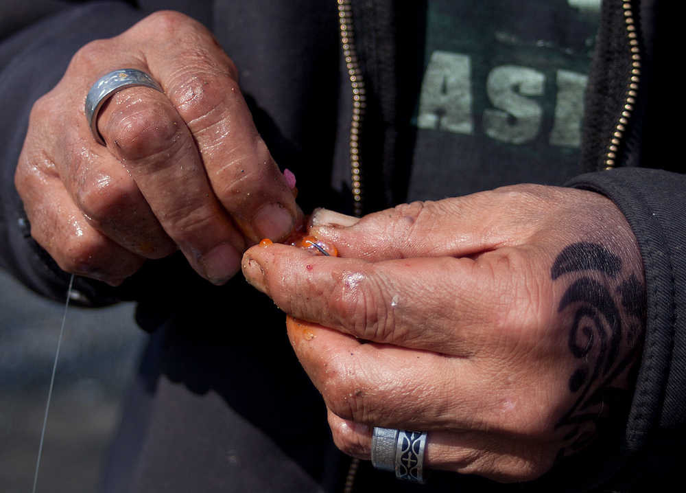 Photo by Rashah McChesney/Peninsula Clarion Bill Schmidt, of Sterling, baits his hook Wednesday May 7, 2014 at Sport Lake in Soldotna, Alaska.