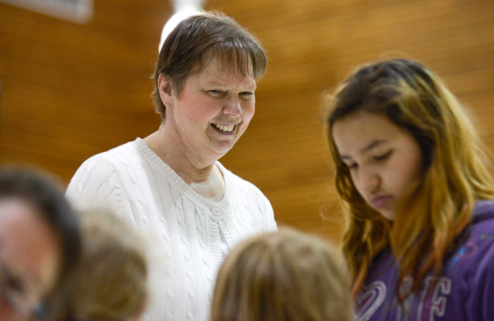 Photo by Rashah McChesney/Peninsula Clarion Norma Holmgaard, retiring principal of Mountain View Elementary school, chats with a table of students during lunch Friday May 16, 2014 in Kenai, Alaska.