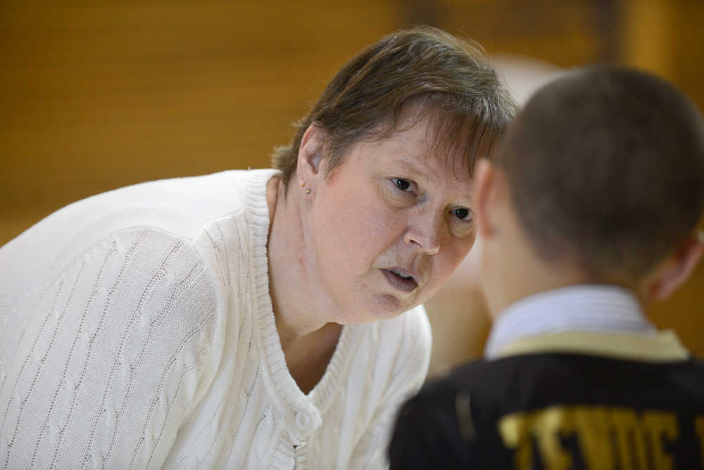 Photo by Rashah McChesney/Peninsula Clarion  Mountain View Elementary school principal Norma Holmgaard listens as a student tells a story during lunch time May 16, 2014 in Kenai, Alaska. Holmgaard is leaving the Kenai Peninsula Borough School District at the end of the 2013-14 school year.
