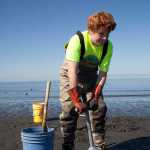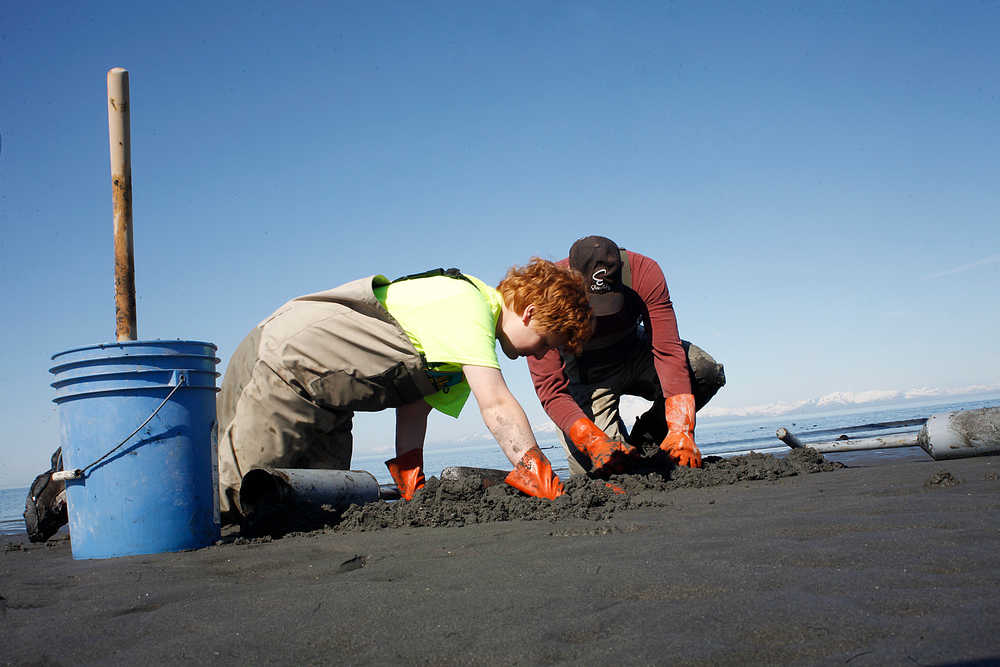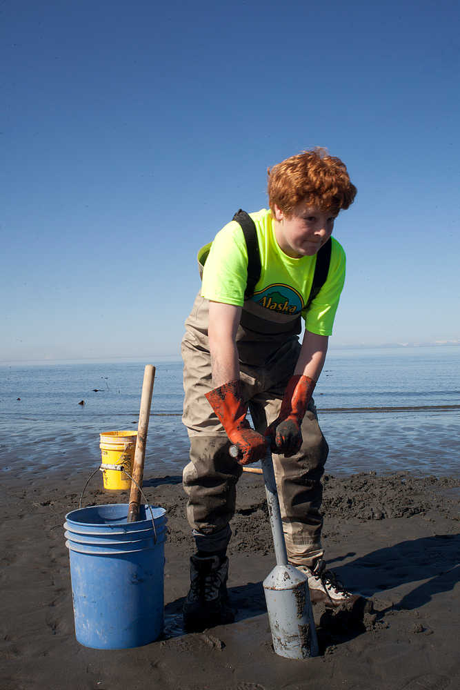Photo by Rashah McChesney/Peninsula Clarion Ted Nichols, 12, of Chugiak, goes digging for clams at the Whiskey Gulch beach access Saturday May 18, 2014 in Anchor Point, Alaska.