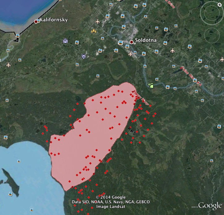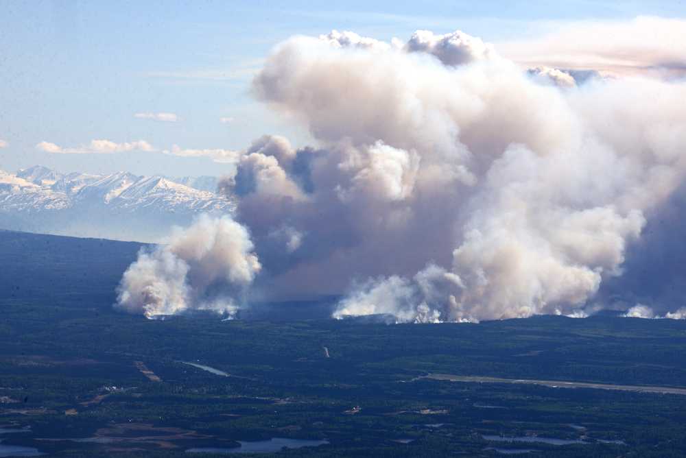 The ceiling of the smoke column reached at least 8,000 feet into the sky, dwarfing portions of Soldotna, Kasilof, Clam Gulch and running south along the eastern shore of the Cook Inlet. A satellite image posted by the Alaska Department of Natural Resources-Division of Forestry on Tuesday showed heavy smoke from the blaze drifting south over Homer as far as Kodiak and curling east out over the Gulf of Alaska.