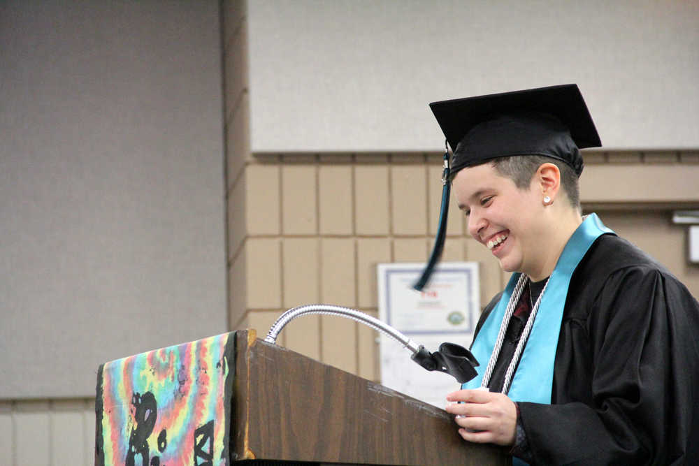 Jordan Fletcher, River City Academy graduate laughs during a speech at the school's graduation ceremony at the Soldotna Regional Sports Complex on Wednesday. Photo by Kaylee Osowski/Peninsula Clarion