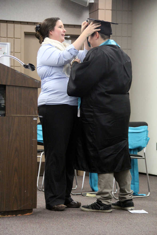 River City Academy Principal Dawn Edwards-Smith adjusts graduate Shelby Fletcher's mortarboard one last time after knocking it off during a hug at the school's graduation ceremony at the Soldotna Regional Sports Complex on Wednesday. Photo by Kaylee Osowski/Peninsula Clarion