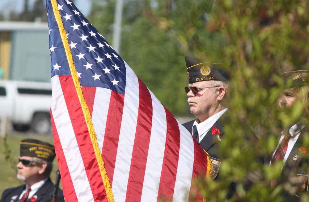 Speaker Jim Herrick, commander of American Legion Post No. 20 stood before the crowd gathered at Soldotna Community Memorial Park, in the rattling wind, Monday. He raised a polished marble cane in his right hand and directed it before him.
