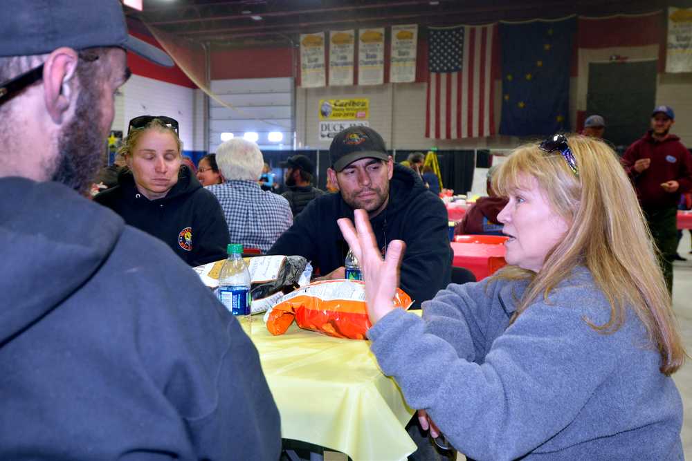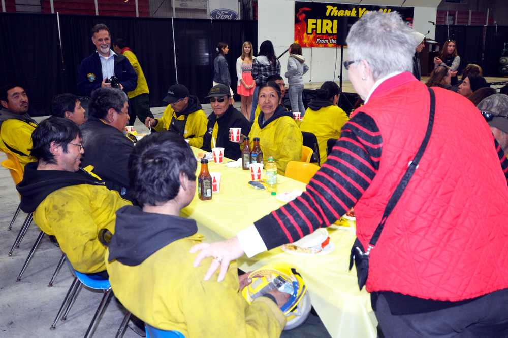 Kenai Mayor Pat Porter (right) and Senator Peter Micciche R-Soldotna, (left) talk with Division of Forestry firefighters at the appreciation dinner Sunday at the Soldotna Regional Sports Complex. Micciche helped coordinate the dinner to allow the community an opportunity to thank firefighters in person for their efforts in containing the Funny River Horse Trail wildfire that has grown more than 193,000 acres but not destroyed any homes.