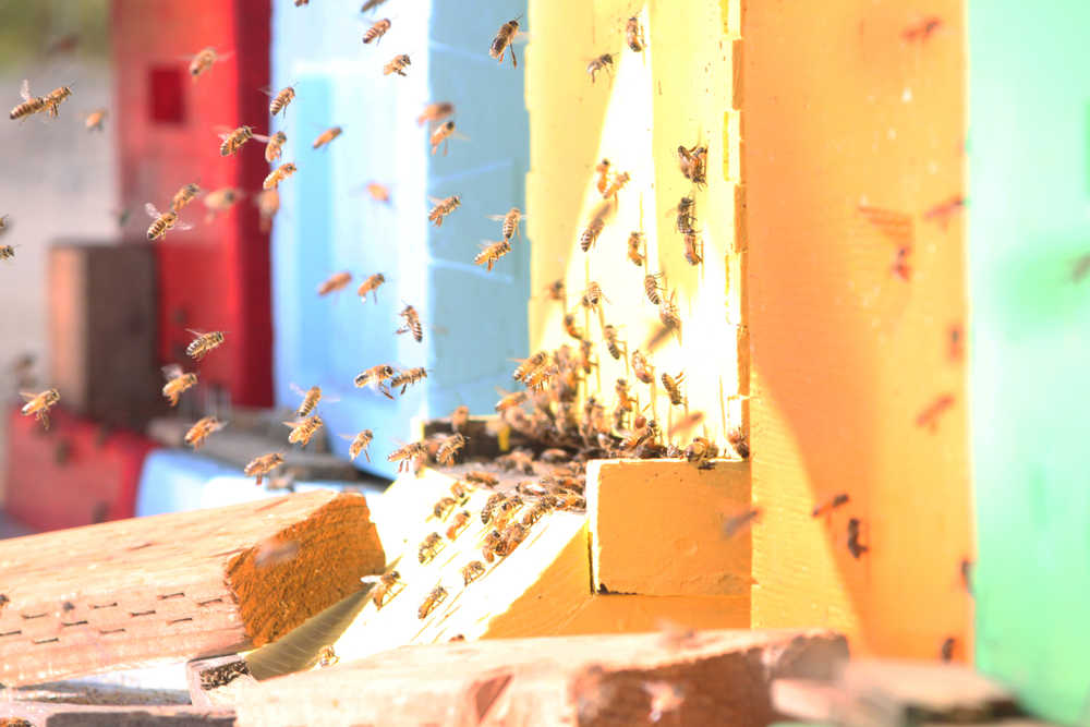 Just outside of one of O’Brien’s high tunnels, an assortment of rainbow painted boxes brim with distracted bees.
