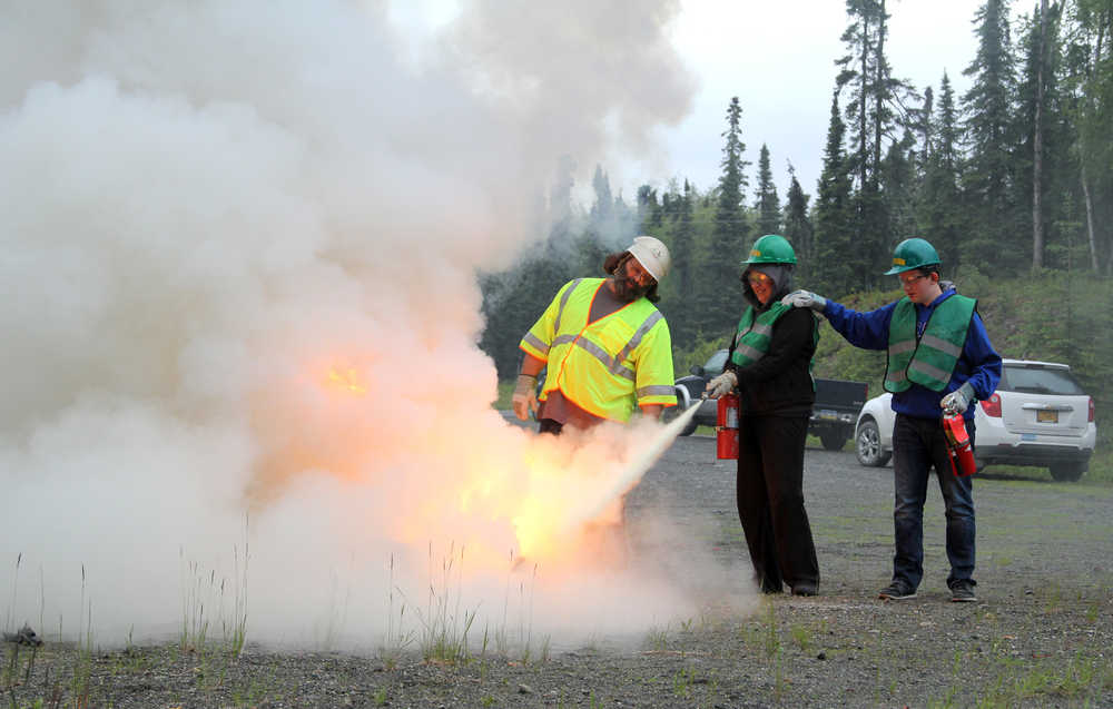 The participants, some of whom had never used a fire extinguisher, were students in the Kenai Peninsula Borough’s Community Emergency Response Team course.