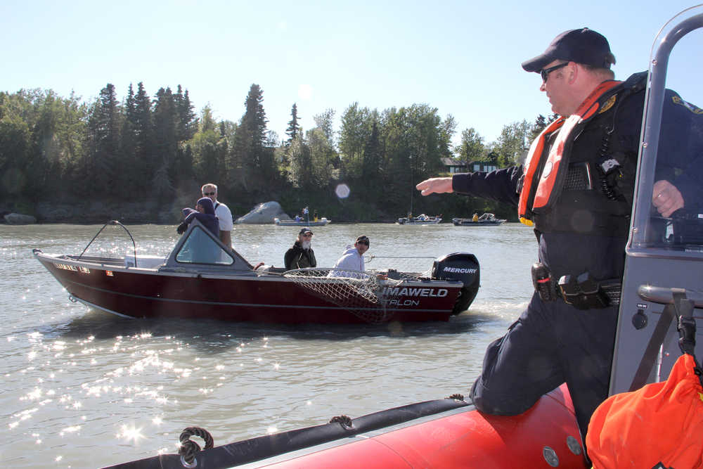 Kenai Battalion Chief Tony Prior said the target area is patrolled only during high tide with one boat operator from the fire department and two police officers on board for enforcement. On Monday, Kenai Fire Department boat operator Courtney Lehl, escort Kenai Police Sergeant Jay Sjogren and seasonal enforcement officer Gabe Boyle took to the river and reminded boaters of the new regulation.
