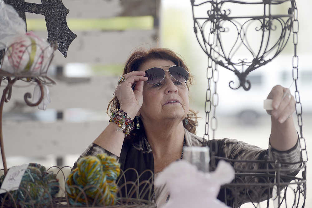 The incessant noise of the crowded Sterling Highway faded quickly in a gravel lot behind Pizza Boys and the Shops Around the Corner Saturday where a group of five white tents clustered around a makeshift courtyard. Ella Fitzgerald sang about bringing her sweet daddy home as dozens of shoppers moved among tables stacked with a mix of antiques and art in a flea market-style shopping experience. At the center of it all, a tall, white elegantly stylized sign marking the new Swank Street Antiques & Art Market rose above tables and benches pointing toward a stage where several musicians have played throughout the market’s opening weekend.
