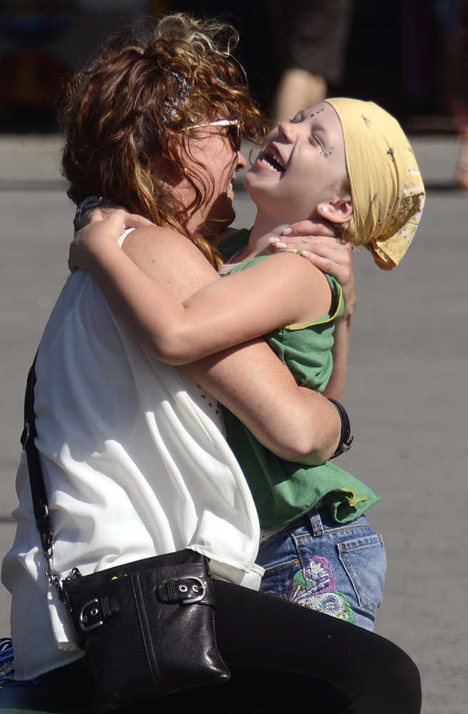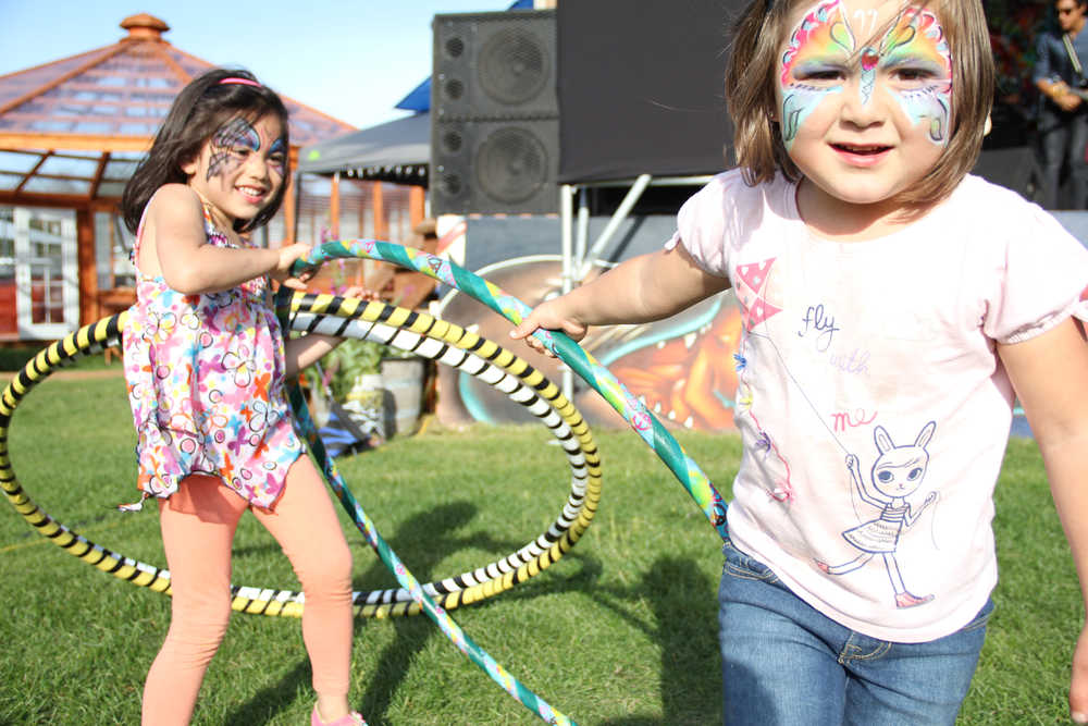 Colorful paint butterflies flitted over the wide smiles on the faces of cousins Miah Anthony, 5, of Kodiak and Abby Samaniego, 4, of Fairbanks Friday evening as they played with hula hoops in front of the Ocean Stage at Salmonstock in Ninilchik.