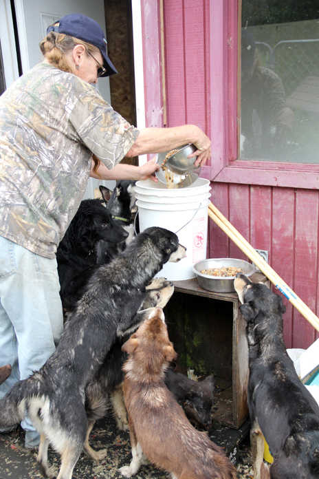 Sue Whipp of the Alaska's Extended Life Animal Sanctuary in Nikiski feeds the 35 dogs rescued from a home on Knight Drive near Soldotna Monday night. Photo by Kaylee Osowski/Peninsula Clarion