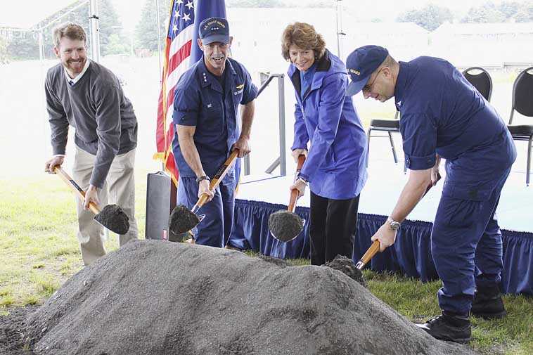 ADVANCE FOR USE MONDAY, AUG. 25 - This Aug. 14, 2014 photo shows from left, housing project manager Lars Wagner, Vice Admiral Charles Ray, commander of the Coast Guard Pacific Area, U.S. Sen. Lisa Murkowski and Capt. Jeffrey Westling, commander of Coast Guard Base Kodiak, scooping up gravel at the groundbreaking ceremony for a new Coast Guard Base Kodiak housing facility in Kodiak, Alaska. The housing facility is expected to be completed in 2016. (AP Photo/Kodiak Daily Mirror, Julie Herrmann)
