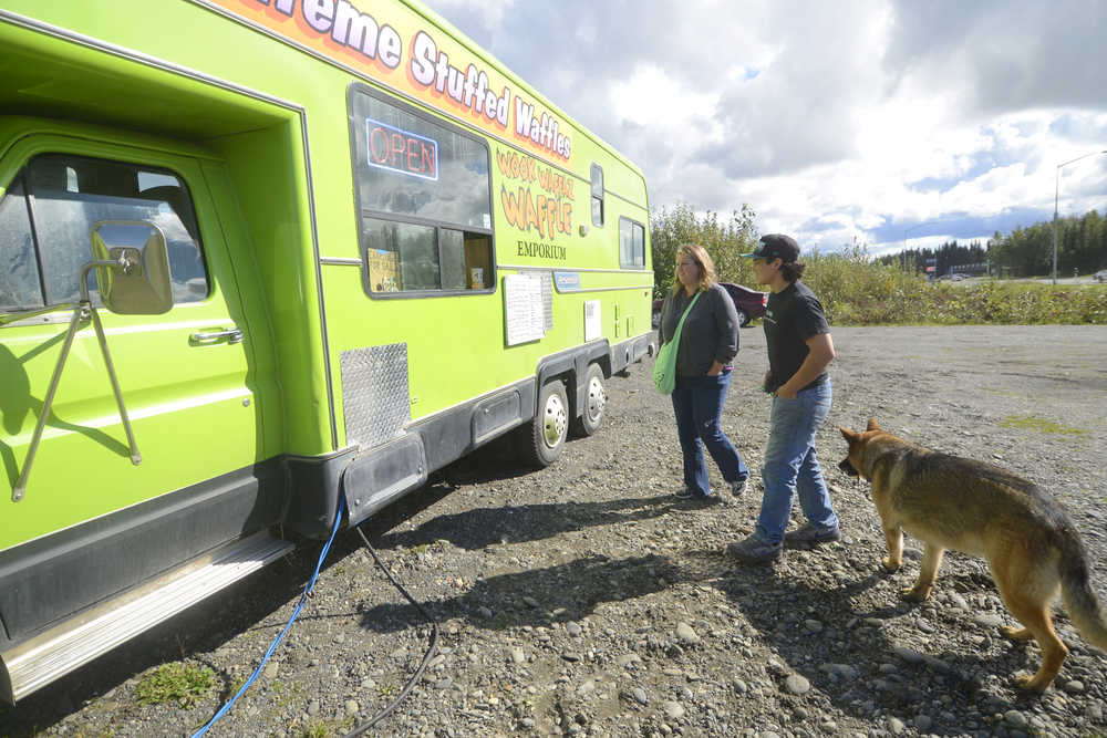 Photo by Kelly Sullivan/ Peninsula Clarion Kim Goggia and Mario Gomez made their first trip to the Wook Waffaz Waffle Emporium food truck, Friday, August 29, 2014 in Soldotna, Alaska.