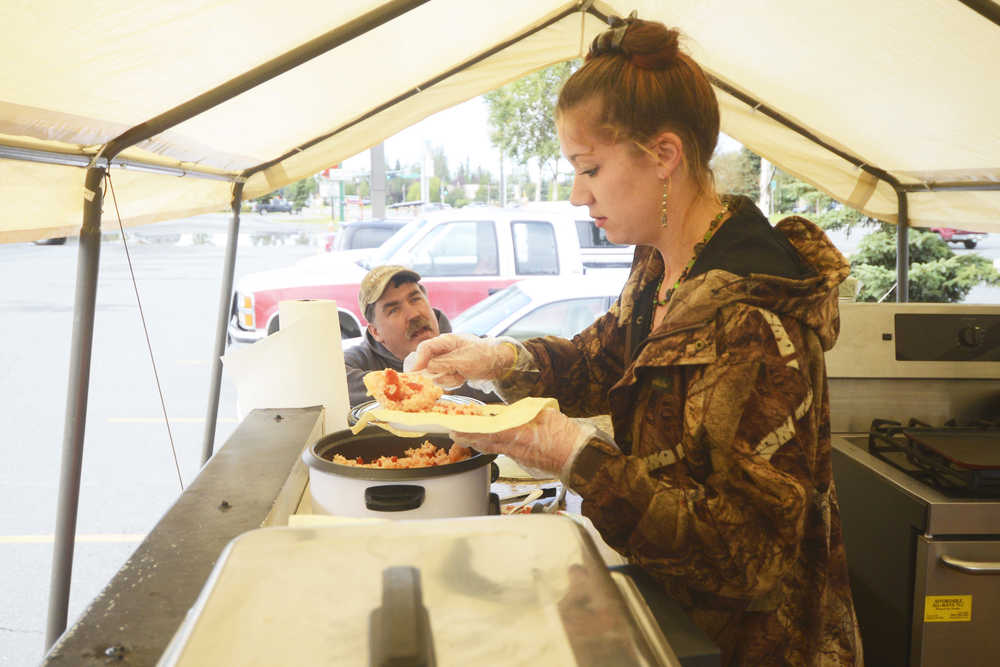 Photo by Kelly Sullivan/ Peninsula Clarion Regular Benny Holly makes an afternoon stop at the AK Taco Shack food truck, which is owned by Shannon Lindley and Mike Beals, Friday, August 29, 2014 in Soldotna, Alaska.