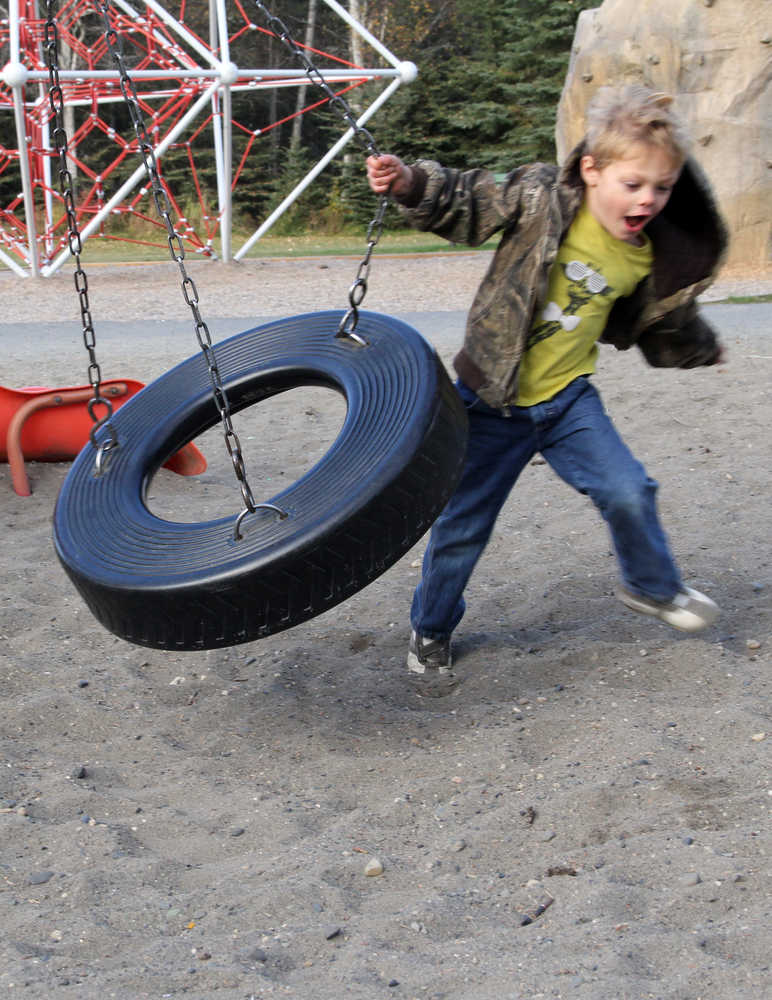 Caleb Mills, 5, plays on the tire swing at Kenai Municipal Park on Sunday. Photo by Kaylee Osowski/Peninsula Clarion