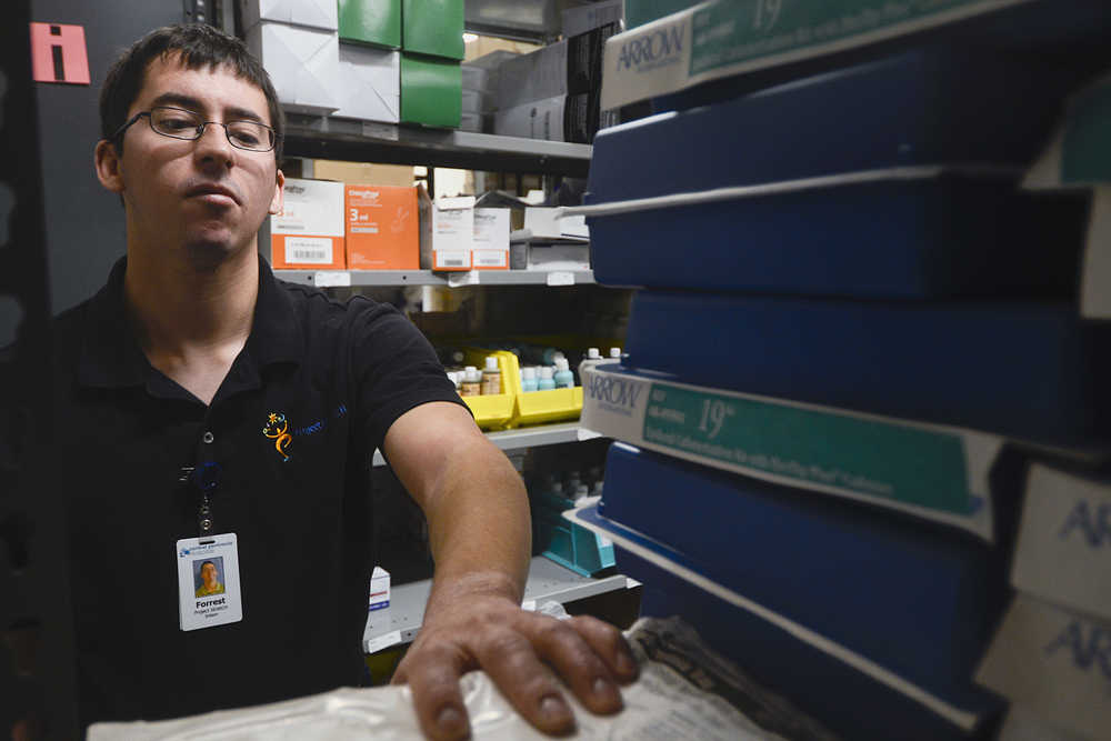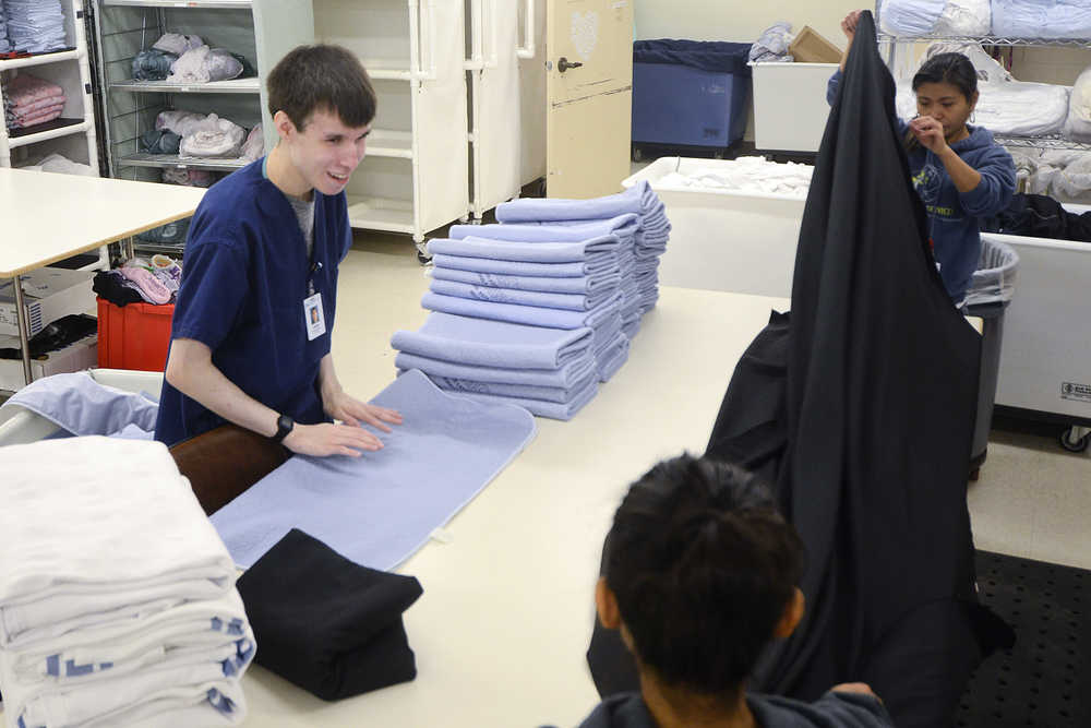 Christopher Petrovich can’t help but smile at his co-workers when they giggle at him as the three fold blankets, sheets and rags piled high in the laundry room at Central Peninsula Hospital.