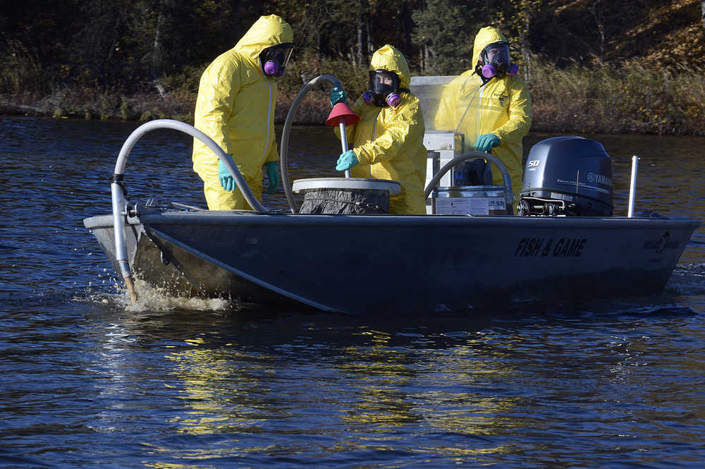 As the last of the interagency team of invasive northern pike killers stepped off of the Derks Lake on Thursday, it began to snow in Soldotna. If all goes according to plan the fish killing piscicide rotenone will work its way through each of the four lakes treated by the Alaska Department of Fish and Game, its degradation slowed by the coming winter. When it breaks down completely, it will leave behind pristine, but empty, waters to be restocked with native fish in the coming years.
