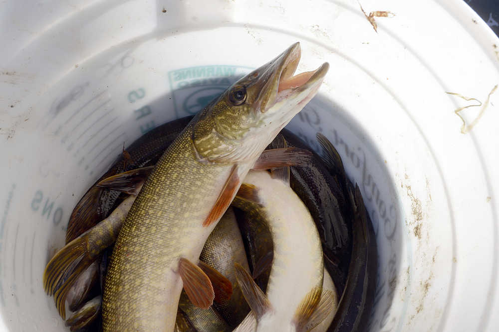 As dozens of personnel in bright yellow hazardous materials suits crossed East Mackey lake on Wednesday, Area Management Biologist Robert Begich and Assistant Area Management Biologist Jason Pawluk sat in a boat netting dead pike that floated to the surface.