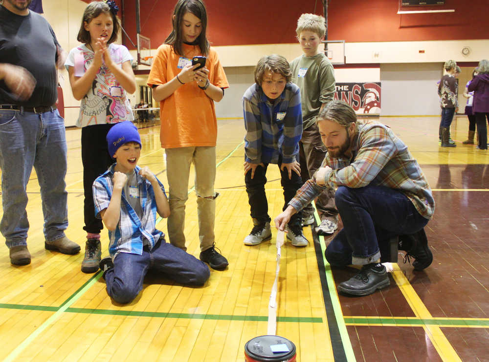 Gabriel Miller, a member of The Sci-Fighters from Ninilchik School, had to fold in half the massive red sail that guided his team’s wheeled boat-like system just to get through the school’s double doors.