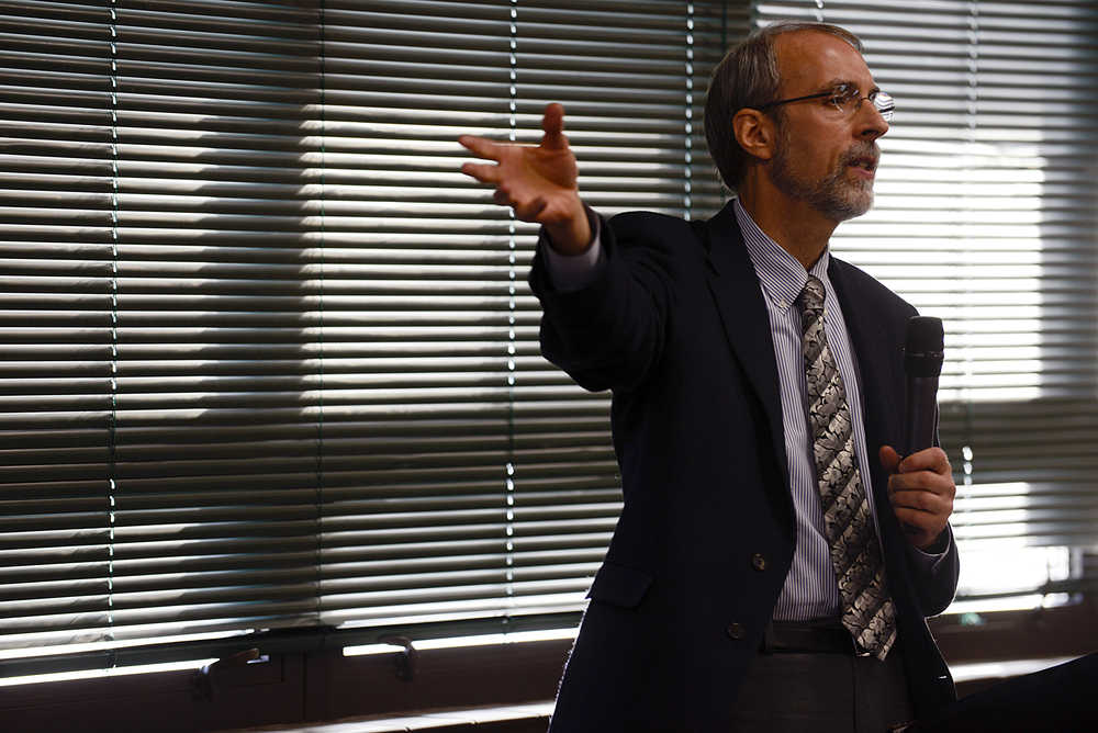 Photo by Rashah McChesney/Peninsula Clarion Larry Persily, federal coordinator in the Federal Office for Alaska Gas Line Projects, speaks about the environmental assessment needed for the Alaska LNG project to progress Tuesday October 28, 2014 in Soldotna, Alaska.