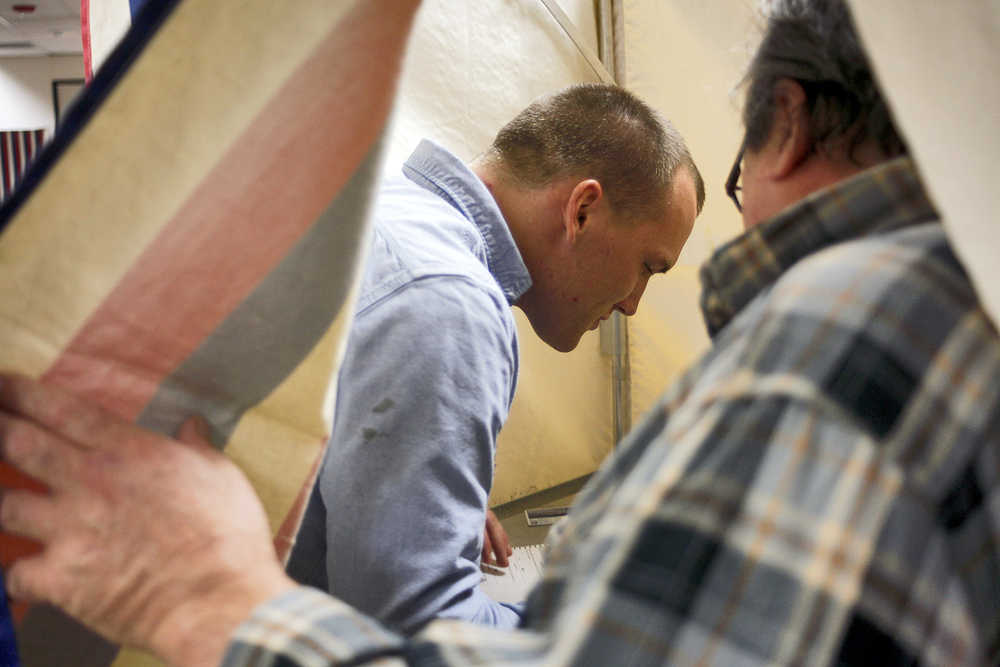 The 24-year-old Soldotna man’s father, George Heaverley, accompanied him into the booth and the two spoke quietly about the candidates, the issues and, ultimately, how Ben Heaverley decided to cast his vote.