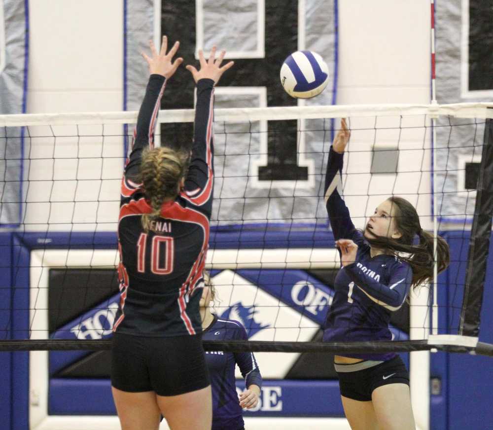 Soldotna's Judah Aley pushes the ball over the block of Kenai's Abby Beck during a 3-1 win over the Kards in the first round of the Northern Lights Conference Volleyball Championships at Palmer High School Thursday.