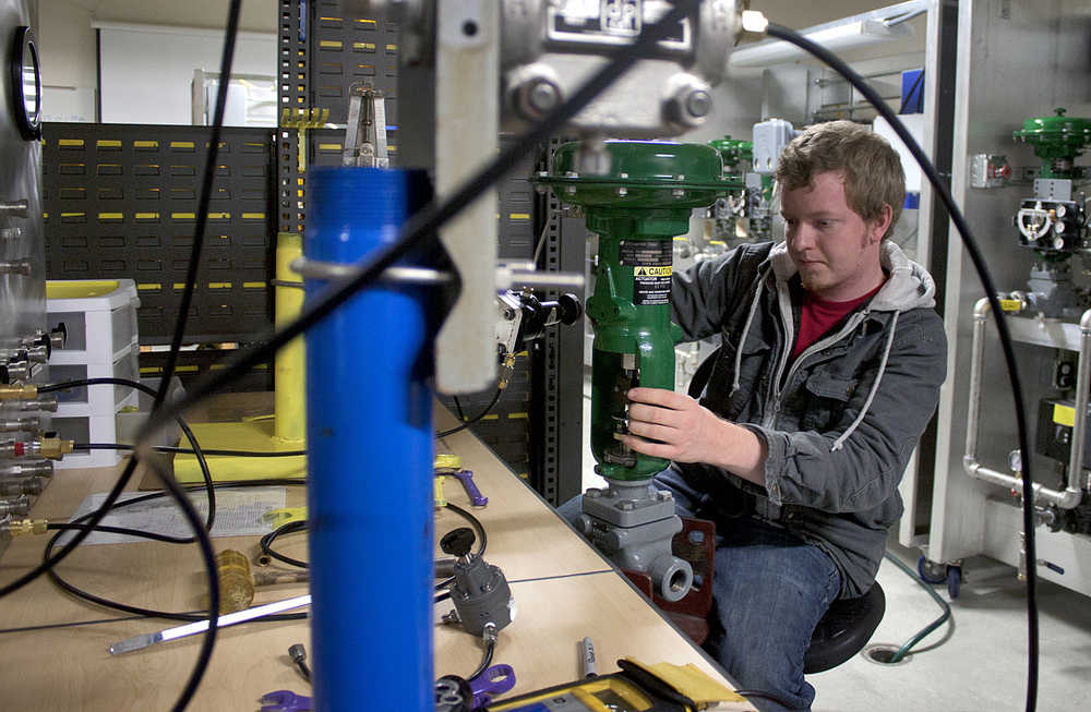 Photo by Rashah McChesney/Peninsula Clarion Carl Hatten, a Kenai Peninsula College - Kenai River campus, student calibrates a pneumatic control valve for a conference in Anchorage on Wednesday Nov. 11, 2014 in the Career and Technical Education Center in Soldotna, Alaska.