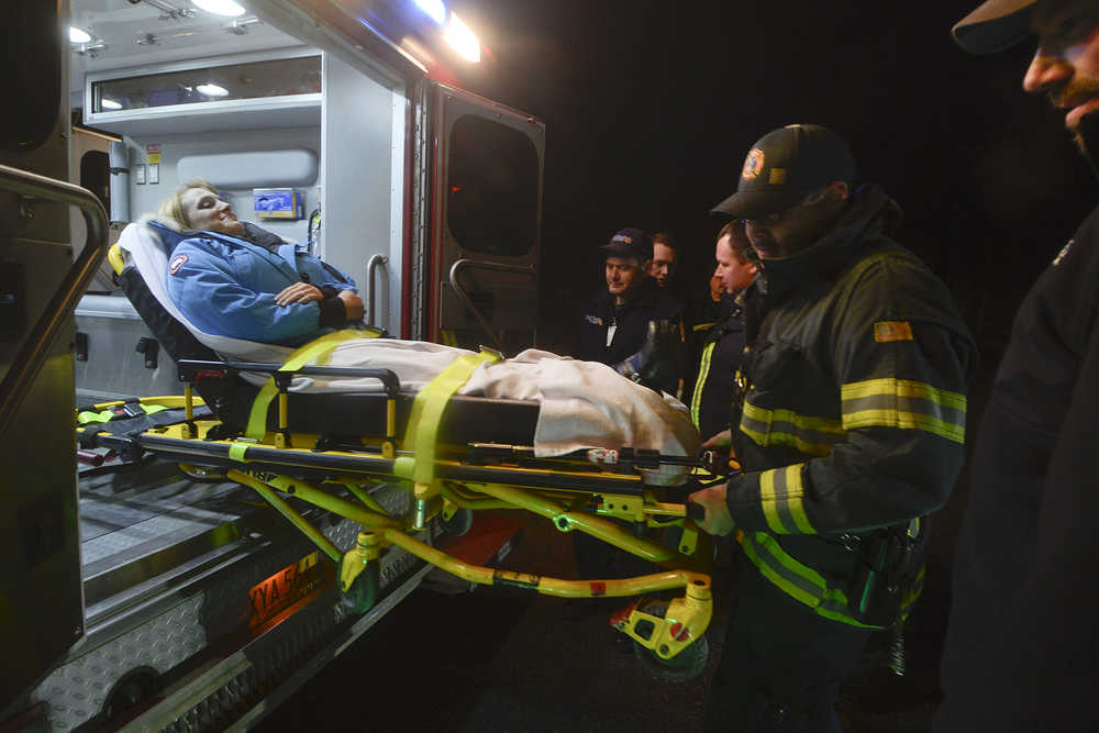 Brooke Marcotte, Kenai PRL Logistics facility coordinator, was volunteered to be the patient for the exercise. Once Nixon called for a helicopter, CES and Kenai paramedics prepared her for transport by getting her on a stretcher and loading her into an ambulance.