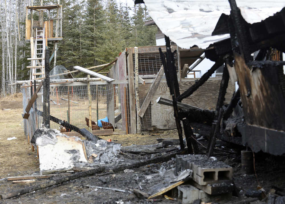 Photo by Dan Balmer/Peninsula Clarion A fire destroyed a trailer home on Rustic Avenue in Soldotna Saturday. The fire is believed to have started in a chicken coop attached to the back of the home. A heating lamp was knocked on a pile of straw and the home was fully engulfed in flames when firefighters arrived.