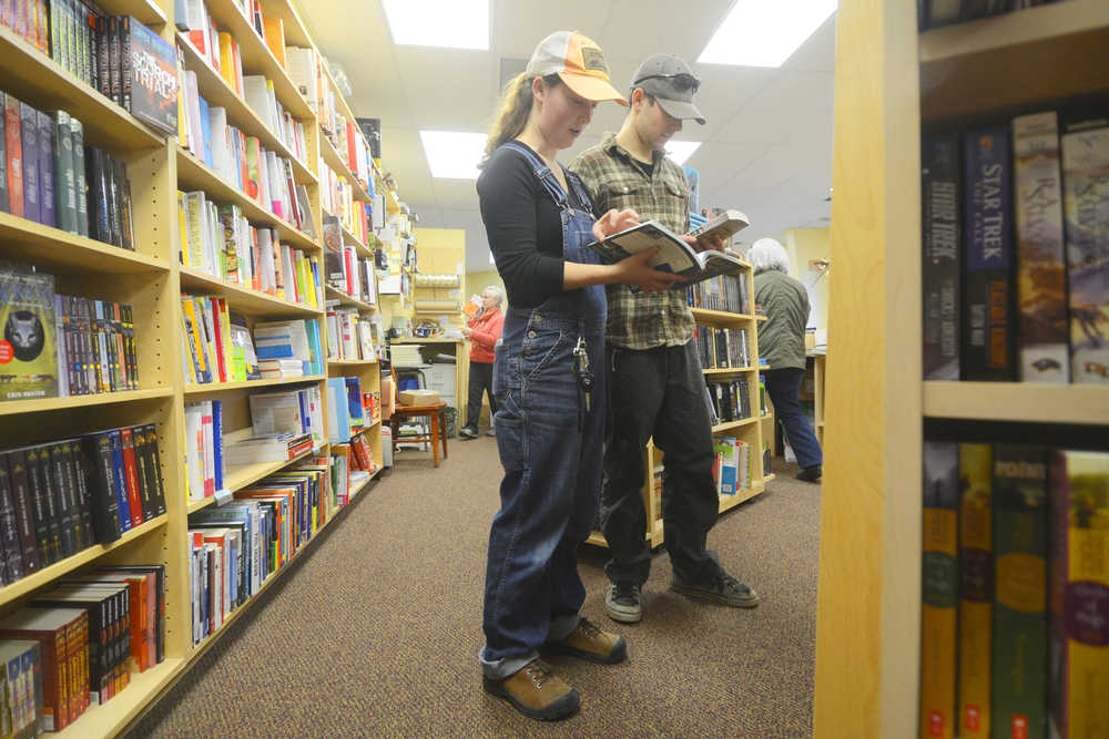 Photo by Kelly Sullivan/ Peninsula Clarion Kyle Hilleary and Amber Smith took time in their off day to peruse the shelves at River City Books Wednesday, Nov. 19, 2014, in Soldotna, Alaska. Smith said they were looking for some rest and relaxation.