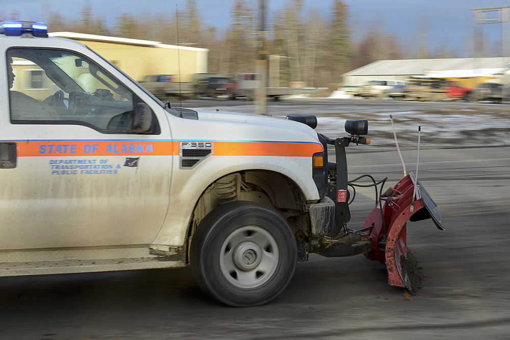 DOT station manager Brian Gabriel used a snow plow on a DOT pickup truck to scrape the bulk of the mud out of the road and onto the shoulder before Emerald Alaska Inc. spill cleanup services crews arrived with a pump truck, a pressure washer and several workers to clean up the road.