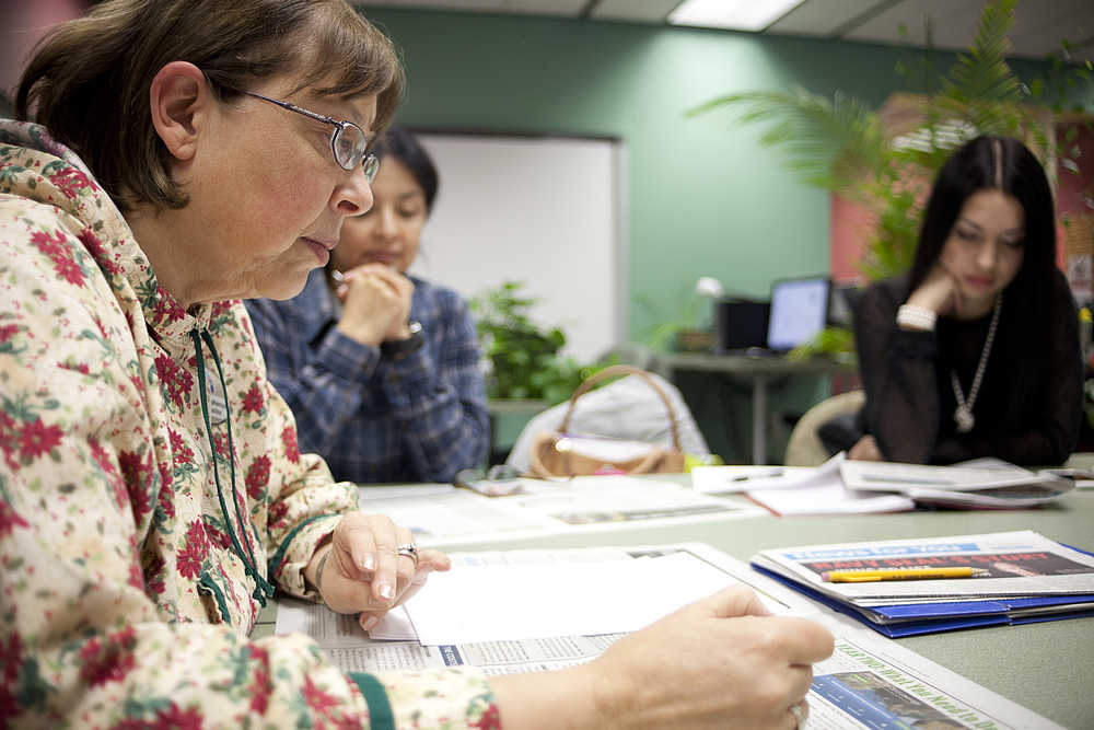 Lena Phillips found the classes immediately after moving to Alaska from Russia. She said that she enjoys the lessons that help her read and understand newspapers, because she finds the stories and the vocabulary interesting.