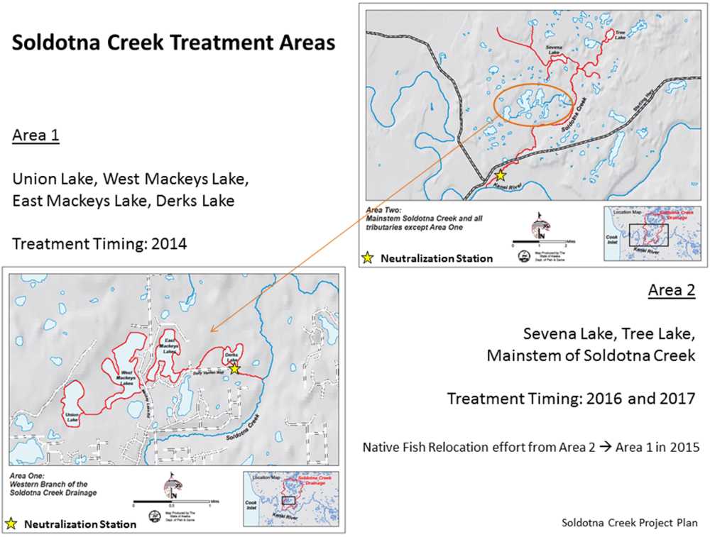 This past October, ADF&G initiated a multi-year effort to rid the entire Soldotna Creek drainage of northern pike. This is the most extensive pike removal project to date. The drainage was divided into two areas by a series of fish barriers. The western branch (Area 1) only contained northern pike and was treated with rotenone in October. Area 2 (comprising the remainder of the drainage) still harbors native fish species and has not been treated with rotenone.