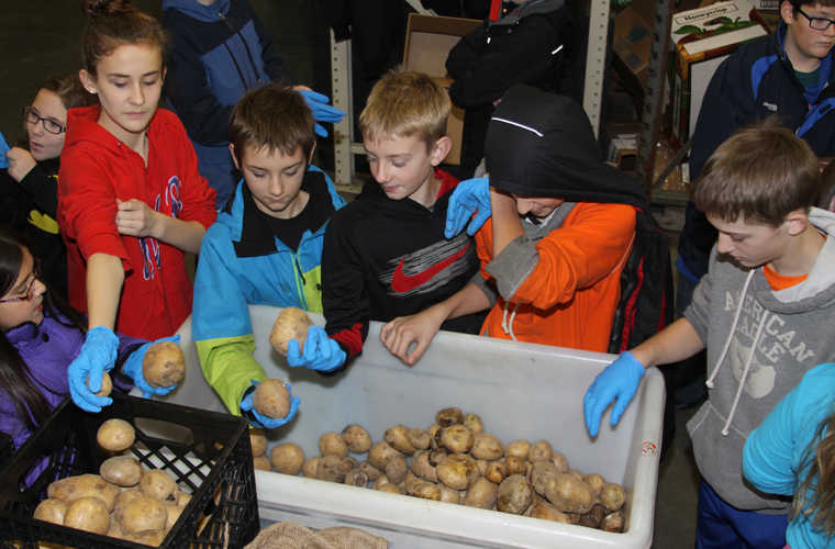 The following week Principal John Pothast dressed as Mrs. Pilgrim Pothast raced against the PE teacher Donny Joachim and lost. The following week when Mrs. Arthur’s students delivered the results of the Great Grocery Grab to the Food Bank, Linda Swarner weighed in 1,114 lbs. of food and the students helped sort local potatoes and fill holiday boxes. The following day as he promised Borough Mayor Mike Navarre showed up with his check for $1,000 for the Food Bank. According to Linda Swarner executive director for the Food Bank the results of this year’s Redoubt Grocery Grab works out to nearly 3,000 meals, “We are very appreciative of the students efforts and their awareness of what we do year round here along with the generosity of individuals like Mayor Mike Navarre it shows community team work to be sure that no one goes hungry and that takes a team effort,” said Swarner.