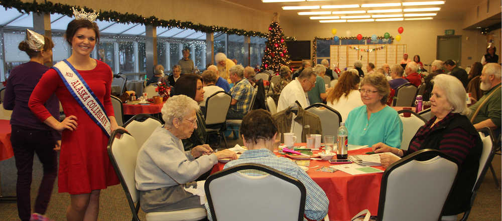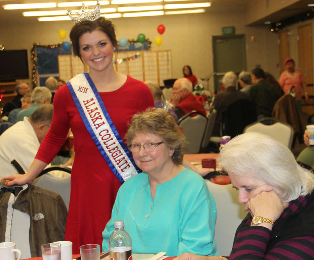 The smiles were broad and appreciation sincere as Kenai senior citizens shared their News Year’s Eve luncheon with hometown beauty queen, the new reigning Miss Alaska Collegiate for 2015. Molly Copple a Kenai Central High School graduate from the class of 2010 came home for the holidays to share her crown with some of her greatest admirers at the Kenai Senior Center. Copple is presently a sophomore at University of Alaska Anchorage majoring in fisheries and wildlife biology while working on her commercial pilot’s license. “Fisheries are a passion of mine and I hope someday to be able to contribute to restoring the king salmon fisheries to their former levels in Alaska,” said Copple. The Miss America Collegiate competition is part of the original Miss America scholarship program minus the swimsuit and talent competition. “While the focus remains on physical beauty and self-confidence, while embracing academic and community service as well. The program is an advocate against bullying and we take that message to high schools across the country. The Miss Collegiate America Pageant competition exists for the purpose of providing personal and professional opportunities for collegiate women. It is their goal to provide outstanding ladies the opportunity to compete in a pageant system that has the highest of moral values,” explained Copple.