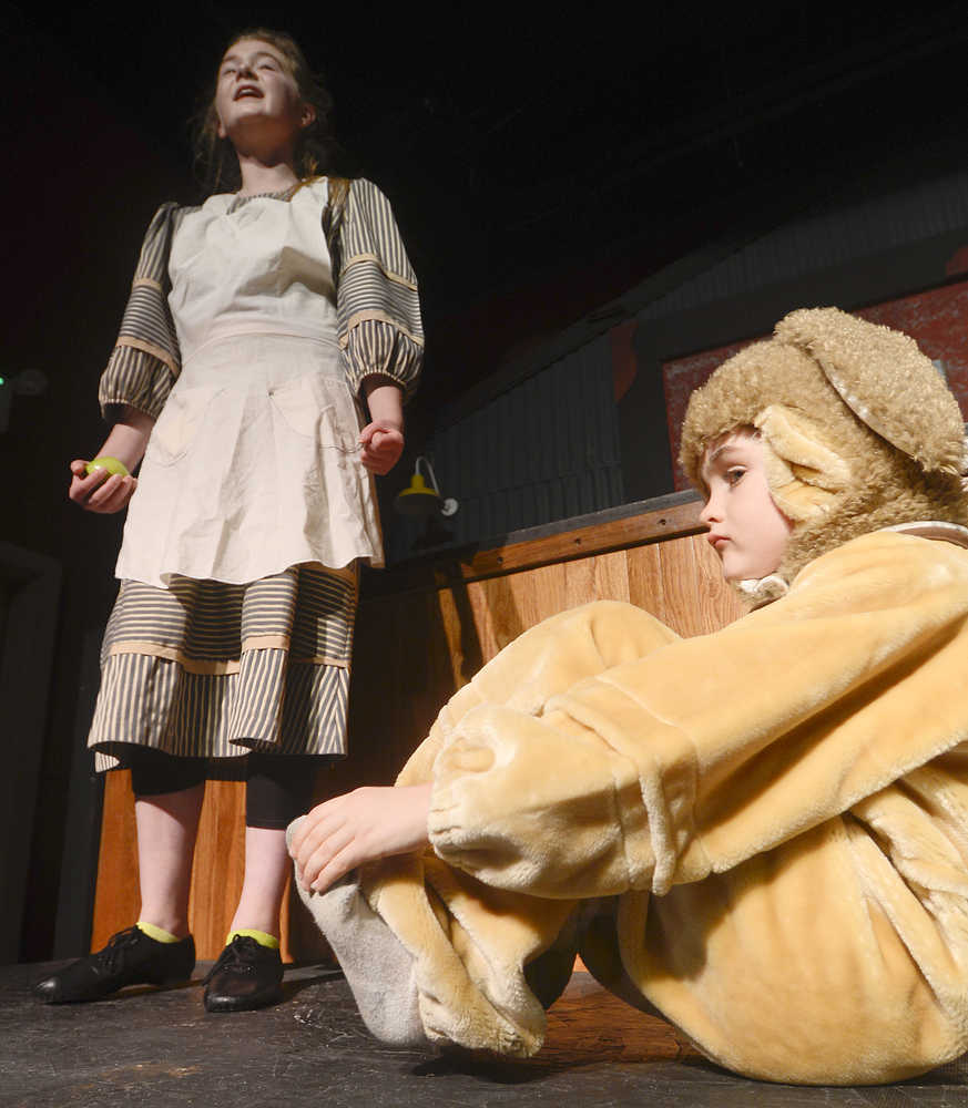 Photo by Rashah McChesney/Peninsula Clarion Annie (Anya Hondel) and a stray dog Sandy (Kincaid Jenness) rehearse for the Triumvirate Theatre's production of the musical Annie on Tuesday Jan. 13, 2014 in Nikiski, Alaska.