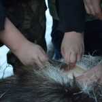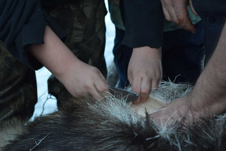 Butchering took place over the weekend, and with the help of dads, moms, grandpas and sharp knives, the cow moose was butchered and processed by the end of the day Saturday. Each of the four families involved took a portion of the moose’s hide and are working on projects in preserving and tanning and sewing.