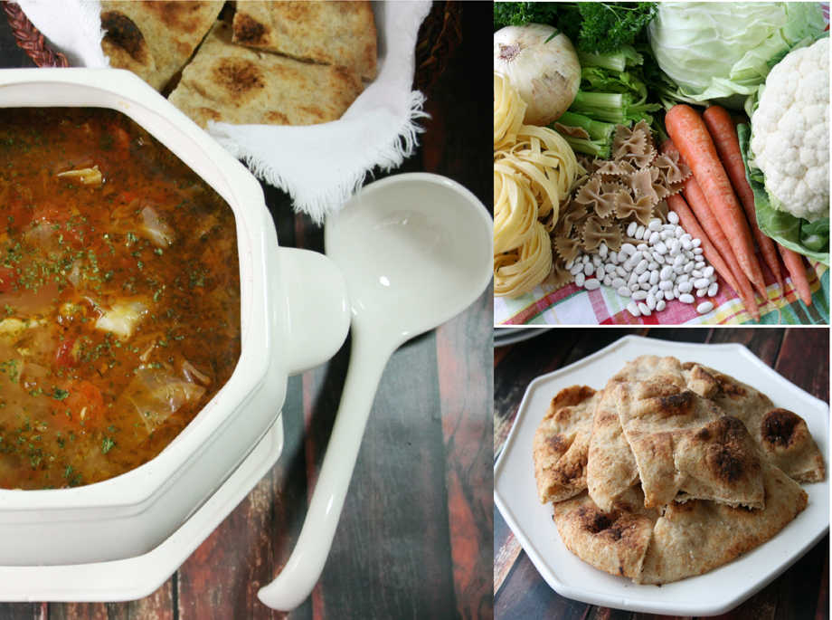 My idea of the perfect meal in winter is soup. Served from a tureen set in the middle of the supper table, it can be as formal or relaxed a dish as you wish, depending on the kind of soup you choose to prepare. Eyeing some above-average looking cauliflower and cabbage at the market recently, I decided I would make a peasant-style vegetable soup, so I also picked up carrots, celery, sweet onions, red potatoes and a big fat bunch of parsley. Pasta is good in vegetable soup, as are beans, so some fettuccine nests and dried Great Northern beans went into my basket, too, along with a new packet of yeast for making flatbread to go with the soup. By the time I got home from the market, the weather was turning nasty – gray sky, cold temperatures and rain – a good day for soup, I thought. I started the bread first, and then, while the dough was going through its first rise, put together the soup, smooth sailing after the vegetables were prepped. While the bread dough was rising for the second time, I cooked the pasta. A meal consisting of soup and bread would be on the table soon and shouting out “soup’s on” will sound good, especially in January.