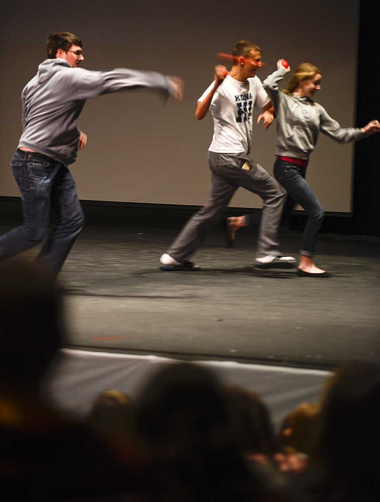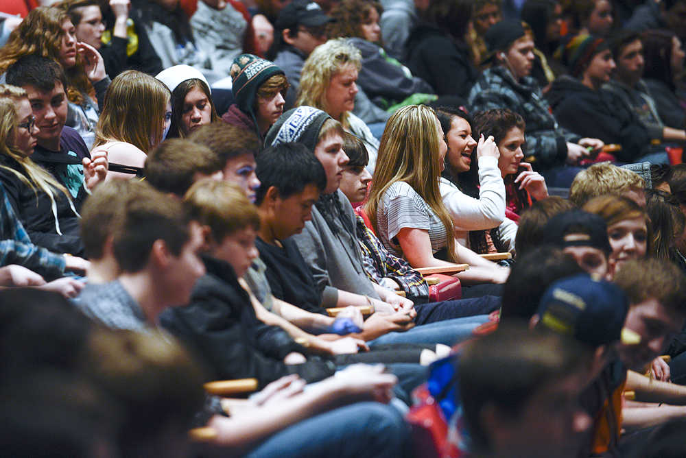 Photo by Rashah McChesney/Peninsula Clarion  Students at Soldotna High School watch a demonstration oof students attacking a shooter, during an ALICE -  Alert, Lockdown, Inform, Counter, and Evacuate - training  on Wednesday Jan. 22, 2015 in Soldotna, Alaska.