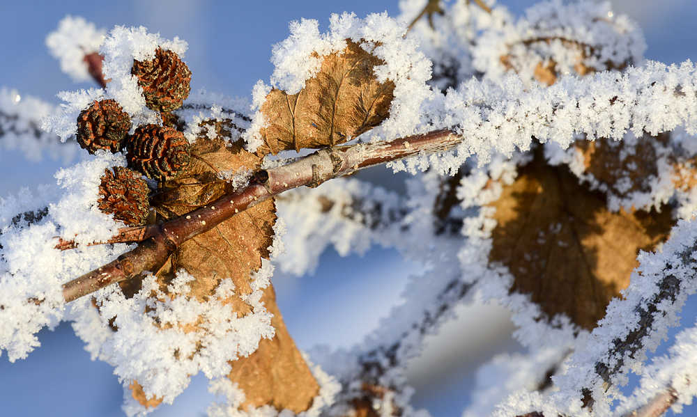 Photo by Rashah McChesney/Peninsula Clarion Ice crystals form on a tree branch recently. Forecasters are calling for continued chilly temperatures and mostly clear skies over the weekend.